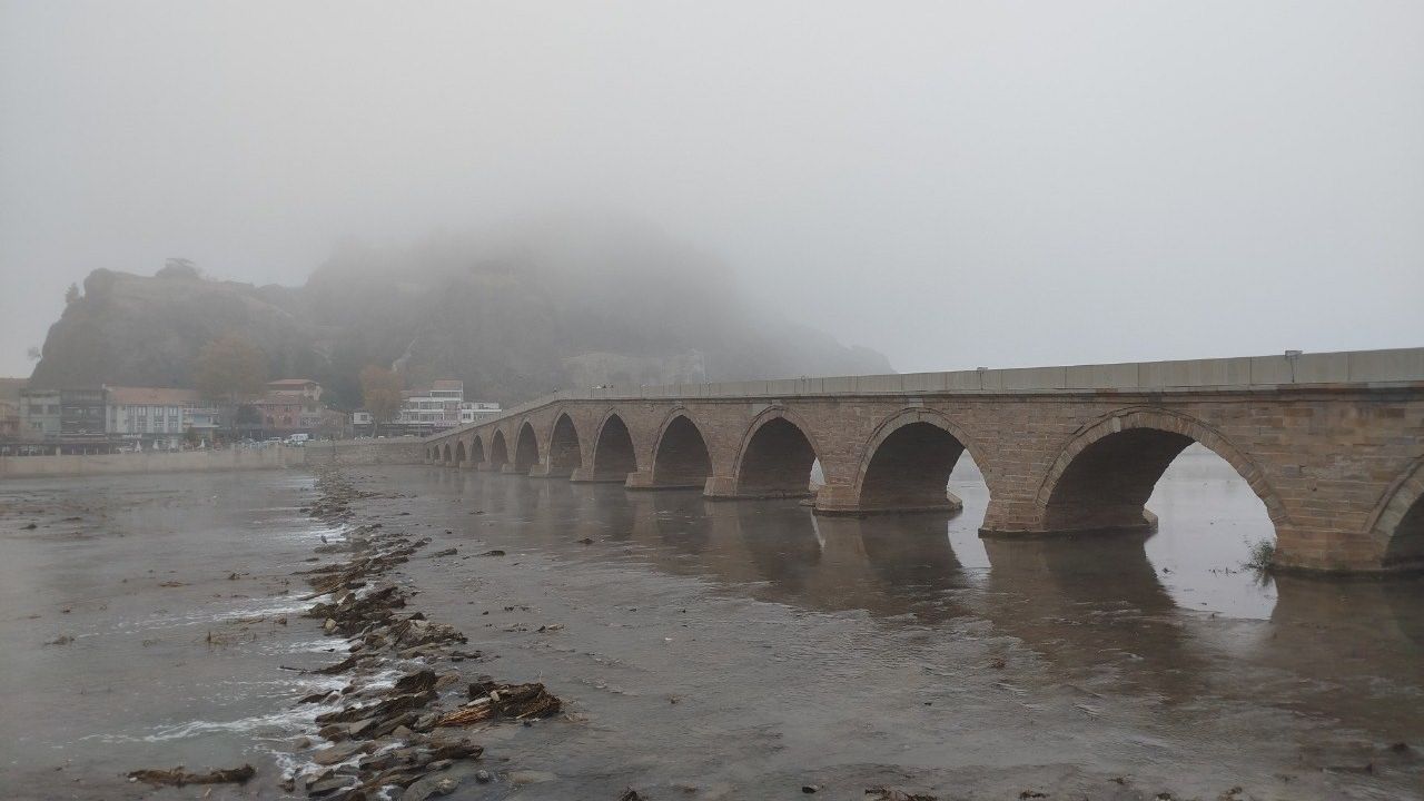 Çorum’un Osmancık ilçesinde sabah saatlerinde etkili olan yoğun sis, ilçenin simgesi tarihi Osmancık Kalesi, tarihi köprüde kartpostallık görüntüler oluşturdu.