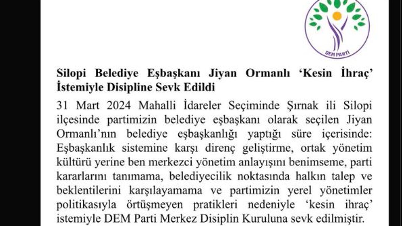 “31 Mart 2024 Mahalli İdareler Seçiminde Şırnak ili Silopi ilçesinde partimizin belediye eşbaşkanı olarak seçilen Jiyan Ormanlı’nın belediye eşbaşkanlığı yaptığı süre içerisinde; Eşbaşkanlık sistemine karşı direnç geliştirme, ortak yönetim kültürü yerine ben merkeziyetçi yönetim anlayışını benimseme, parti kararlarını tanımama, belediyecilik noktasında halkın talep ve beklentilerini karşılayamama ve partimizin yerel yönetimler politikasıyla örtüşmeyen pratikleri nedeniyle ‘kesin ihraç’ istemiyle DEM Parti Merkez Disiplin Kuruluna sevk edilmiştir. Jiyan Ormanlı hakkındaki disiplin süreci tamamlandığında konunun detayları ve sonuçları kamuoyu ile yeniden paylaşılacaktır.” (DHA)