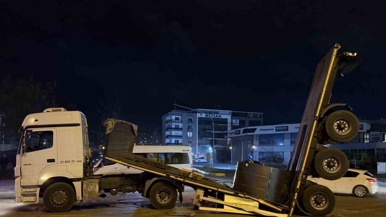 Hatay’da demir yüklü tırın dorsesi, seyir halindeyken ortadan ikiye ayrıldı. Dorseden düşen saçlar çevreye zarar vermezken, dorsenin arka kısmı şaha kalktı.