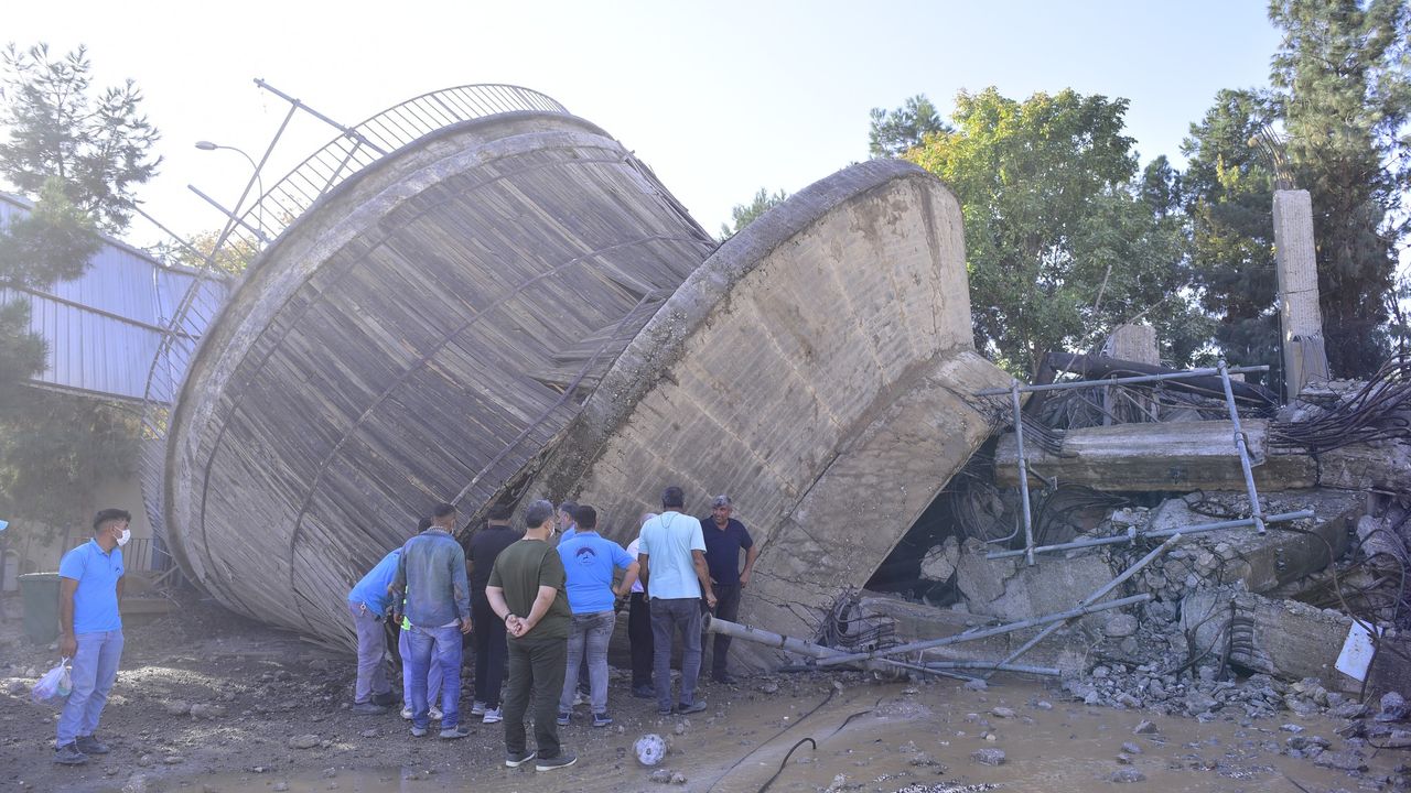 Kahramanmaraş merkezli 6 Şubat 2023 tarihli depremlerin etkilediği Şanlıurfa'da ağır hasar gören yapıların yıkımı devam ediyor. Ceylanpınar ilçesinde uzun yıllar su ihtiyacını karşılayan 51 yıllık su kulesinin de depremde hasar görmesi nedeniyle yıkılmasına karar verildi. Belediye garajında bulunan su kulesinin yıkımı için güvenlik önlemleri alındıktan sonra iş makinesiyle çalışma başlatıldı. İş makinesinin müdahalesinin ardından su kulesi kontrollü olarak yıkıldı. Yıkım sırasında etraf ise toz bulutu ile kaplandı. (DHA)