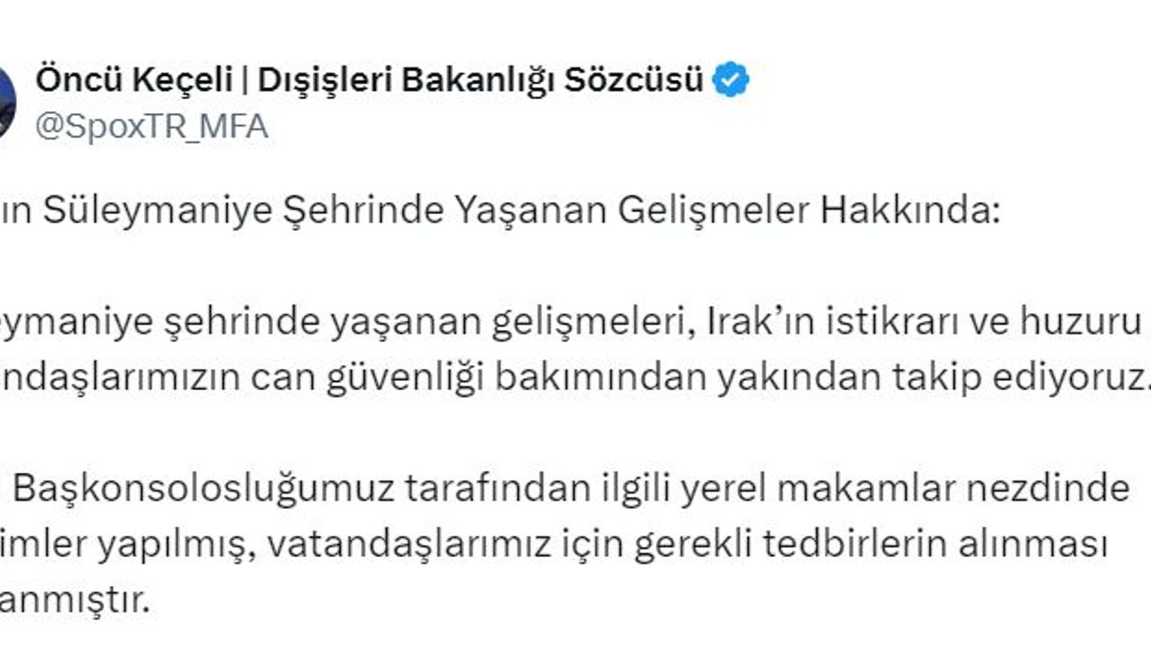 Dışişleri Bakanlığı Sözcüsü Öncü Keçeli, sosyal medya hesabından yaptığı açıklamada, "Süleymaniye şehrinde yaşanan gelişmeleri, Irak’ın istikrarı ve huzuru ile vatandaşlarımızın can güvenliği bakımından yakından takip ediyoruz. Erbil Başkonsolosluğumuz tarafından ilgili yerel makamlar nezdinde girişimler yapılmış, vatandaşlarımız için gerekli tedbirlerin alınması sağlanmıştır" denildi. (DHA)