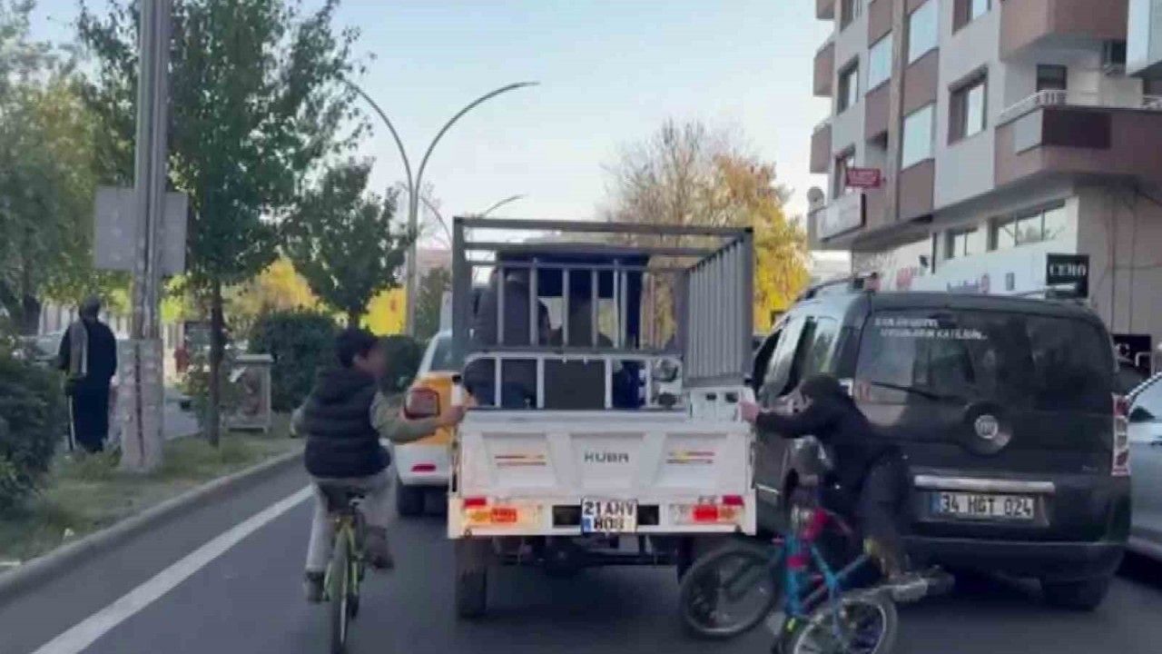 Diyarbakır’da bisikletli iki çocuk, canlarını tehlikeye atarak sepetli motora tutunup ilerledi. Çocuklardan biri başka bir aracın altında kalmaktan son anda kurtuldu.