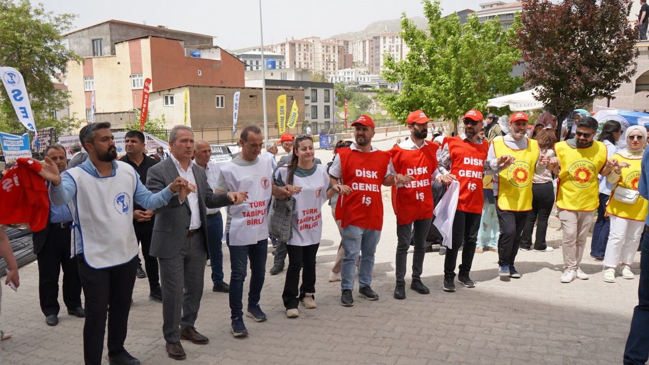 Şırnak’ta sabah saatlerinde Cumhuriyet Meydanı’nda toplanan çeşitli sendika üyelerinden oluşan grup, KESK İl Binası’na doğru yürüyüşe geçti. Yürüyüş boyunca ‘Hak, Hukuk, Adalet’ ve ‘Yaşasın 1 Mayıs’ sloganları atıldı. Çarşı merkezinden geçen kortej yürüyüşün ardından etkinliğin yapılacağı KESK İl Binası önüne ulaşan grup, halaylar çekti. Etkinliğe Milletvekili Mehmet Zeki İrmez, Cizre Belediye Eş Başkanları Güler Yerbasan ve Abdurrahim Durmuş, Silopi Belediye Eş Başkanı Jiyan Ormanlı, DEM Parti İl Eş Başkanları Ramazan Uysal ve Taybet Bilgi, CHP İl Başkanı Sait Namdar, DİSK, Eğitim-Sen ve SES İl şubeleri ile Şırnak Tabip Odası ve sendikaların ilçe temsilcileri katıldı.