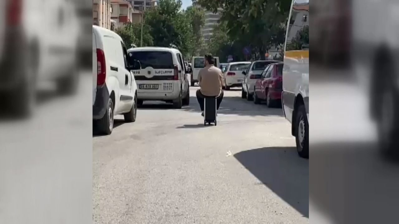 Altındağ ilçesindeki Akköprü kavşağında elektrikli skuter valizle trafikte yolculuk yapan kişi dikkat çekti. Trafiğin yoğun olduğu yolda valiz üzerinde oturarak seyreden kişi, başka bir sürücü tarafından cep telefonu kamerasıyla görüntülendi. Görüntüler, sosyal medyada paylaşıldı.