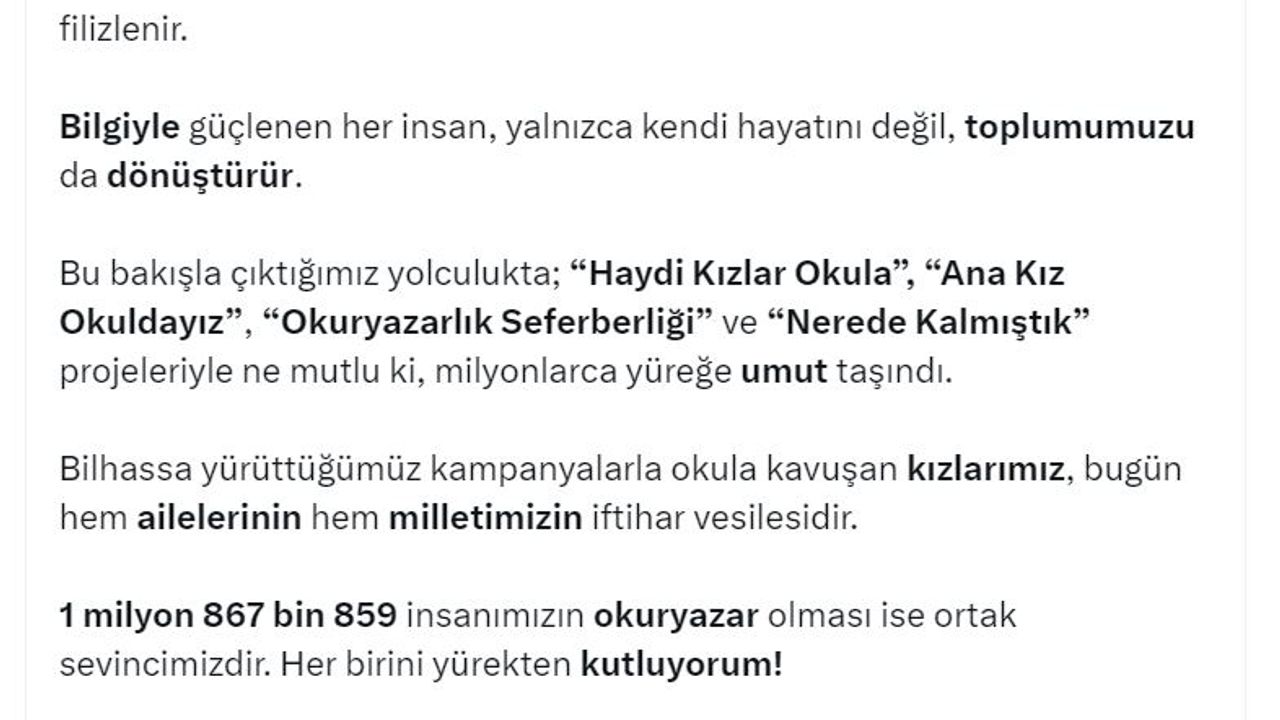 Emine Erdoğan, sosyal medya hesabından yaptığı açıklamada, "Kalemle kağıdın buluştuğu her yerde yeni bir başlangıç, yeni bir inanç filizlenir. Bilgiyle güçlenen her insan, yalnızca kendi hayatını değil, toplumumuzu da dönüştürür. Bu bakışla çıktığımız yolculukta; 'Haydi Kızlar Okula', 'Ana Kız Okuldayız', 'Okuryazarlık Seferberliği' ve 'Nerede Kalmıştık' projeleriyle ne mutlu ki milyonlarca yüreğe umut taşındı. Bilhassa yürüttüğümüz kampanyalarla okula kavuşan kızlarımız, bugün hem ailelerinin hem milletimizin iftihar vesilesidir. 1 milyon 867 bin 859 insanımızın okuryazar olması ise ortak sevincimizdir. Her birini yürekten kutluyorum. Dünya Okuma Yazma Günü vesilesiyle; öğrenmenin, paylaşmanın ve geleceği kurmanın en kuvvetli anahtarına herkesin ulaşmasını diliyorum" dedi. (DHA)