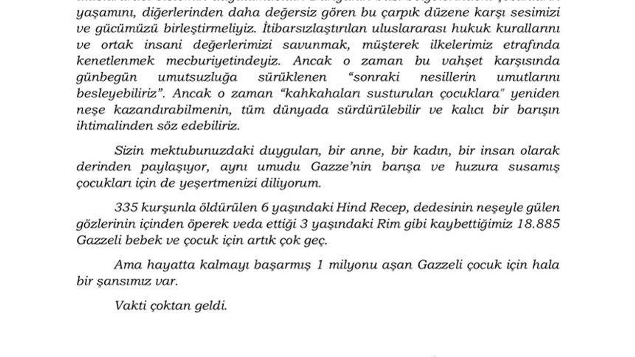 Emine Erdoğan, kahkahaları susturulanların yalnızca Ukrayna'nın çocukları olmadığını, Filistin'in çocuklarının da aynı neşeyi, aynı özgürlüğü, aynı onurlu geleceği hak ettiklerini belirterek, "Gazze'deki insani krizin durdurulmasına yönelik güçlü çağrınızı içeren bir mektubu da İsrail Başbakanı Netanyahu'ya göndermeniz son derece anlamlı olacaktır. Dünyanın ortak bir uyanışa geçtiği, Filistin'in tanınmasının küresel bir iradeye dönüştüğü bu günlerde, Gazze adına sizden gelecek bir çağrının, Filistin halkına tarihi bir sorumluluğun da ifası olacağı kanaatindeyim" dedi.