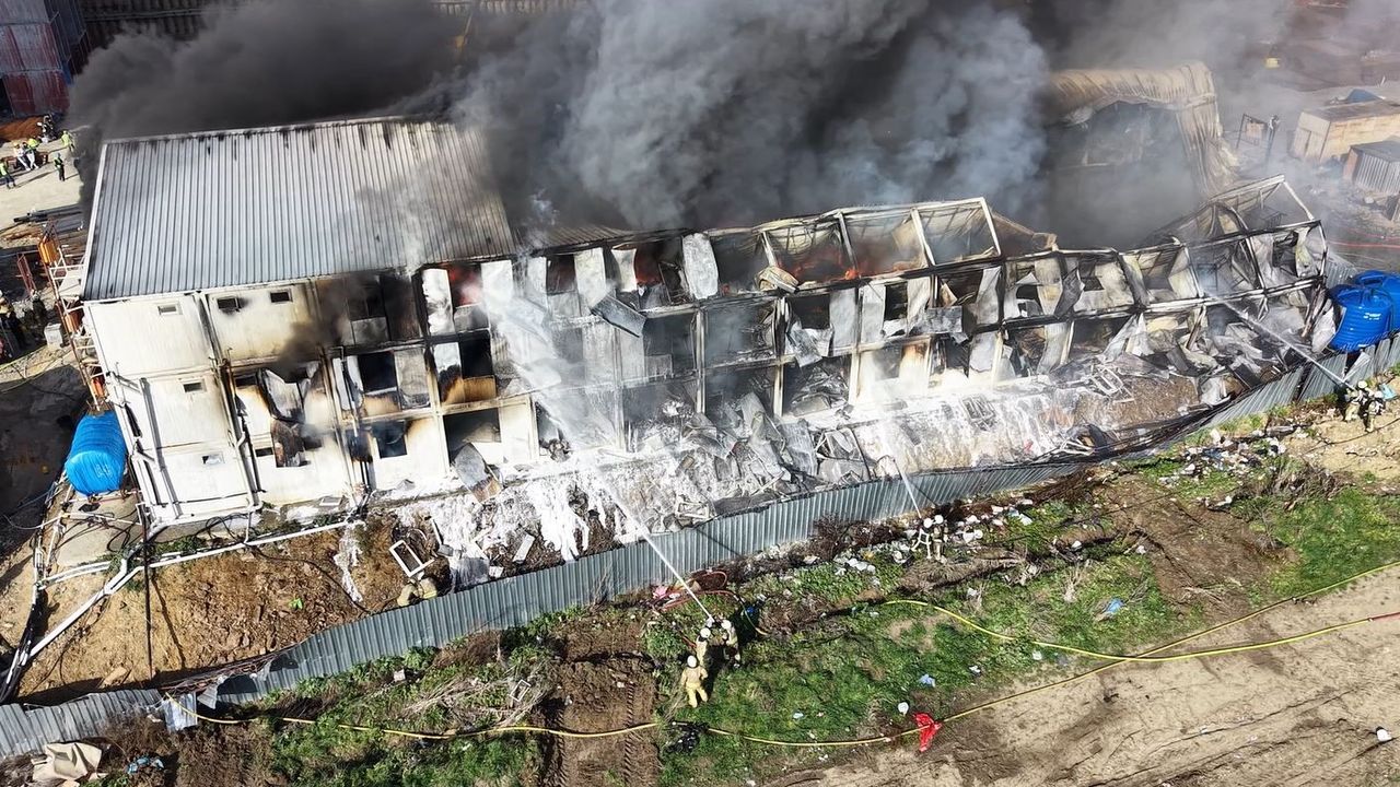 Esenyurt'ta bulunan bir inşaat alanında yer alan işçilerin kaldığı büyük konteynerde henüz bilinmeyen bir nedenle yangın çıktı. Alev alev yanan konteyner havadan görüntülenirken, dumandan etkilenen işçilere sağlık ekipleri müdahale etti. Söndürme çalışması devam ediyor.