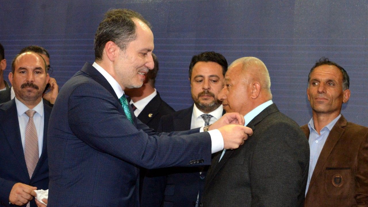 Fatih Erbakan, konuşmasının ardından Yeniden Refah Partisi’ne katılanların rozetlerini taktı. (DHA)