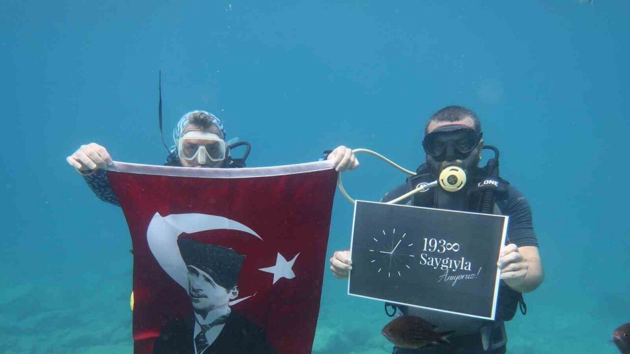 Muğla’nın Fethiye ilçesinde dalgıçlar, Gazi Mustafa Kemal Atatürk’ü deniz altında Türk bayrak açarak andı.