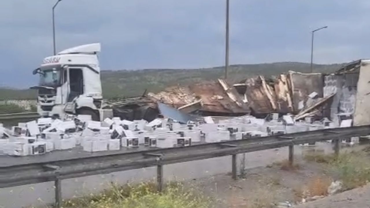 Kadir ÇELİK/NURDAĞI (Gaziantep), (DHA)- GAZİANTEP’in Nurdağı ilçesinde, çikolata yüklü TIR'ın dorsesi devrildi.