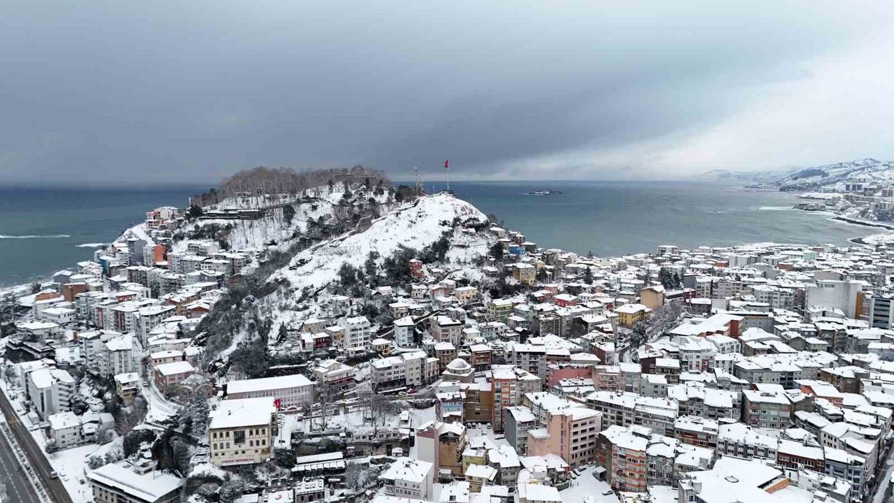 Kar yağışı sonrası Karadeniz sahilinde yer alan Giresun, mavi ile beyazın buluştuğu eşsiz bir manzaraya sahne oldu. Şehrin simgeleri arasında yer alan Gedikkaya ve Giresun Kalesi, beyaz örtüyle kaplanarak görsel bir şölen sundu. Yüksek kesimlerde etkisini artıran kar, kentin siluetini tamamen değiştirdi.