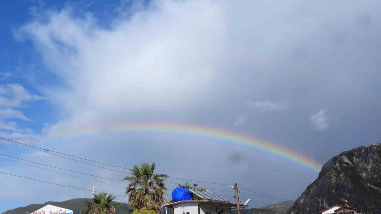 Hatay’ın Samandağ ilçesinde yağmur sonrasında ortaya çıkan gökkuşağı görsel şölen oluşturdu.