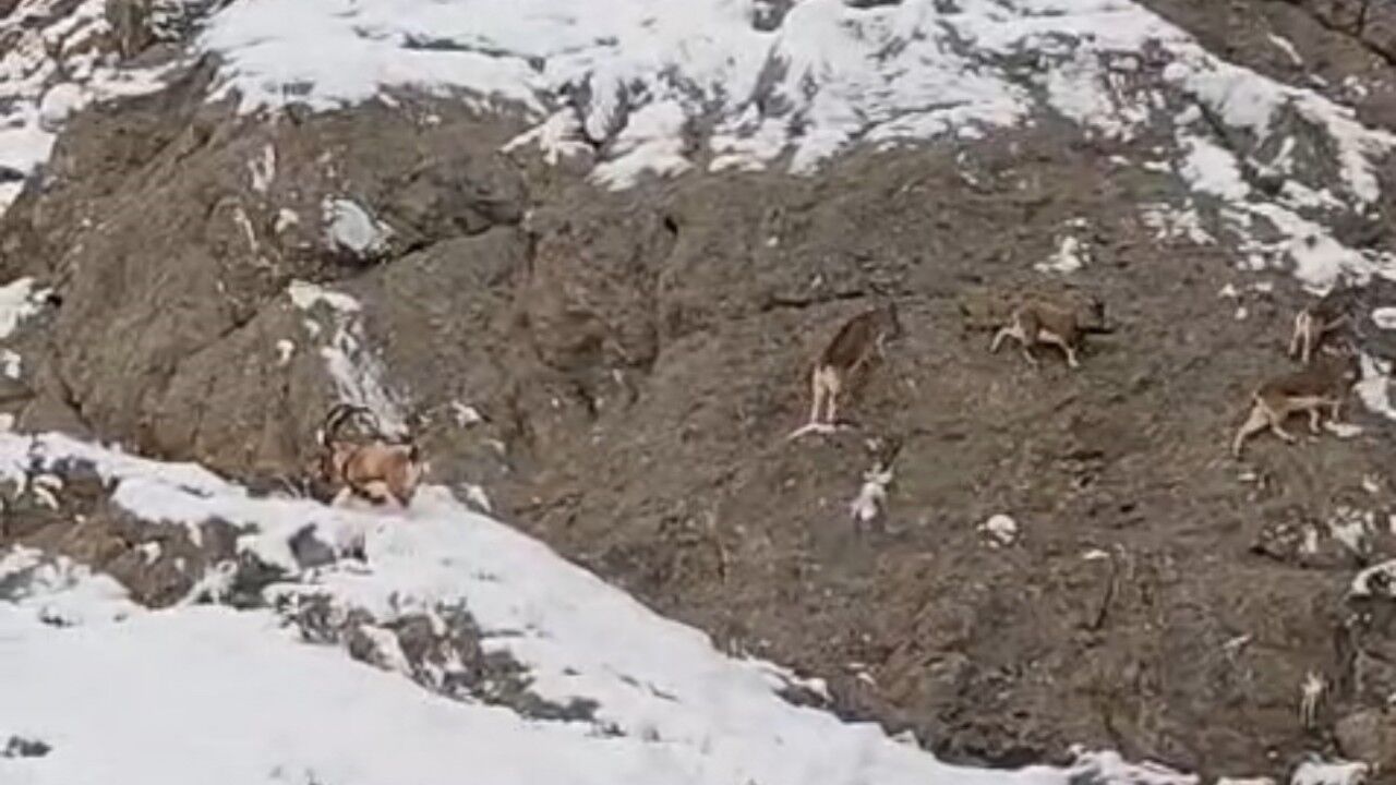 Yüksekova kara yolu üzerinde zorlu coğrafyasıyla bilinen Güzeldere bölgesinin karlı yamaçlarında dağ keçileri görüntülendi.