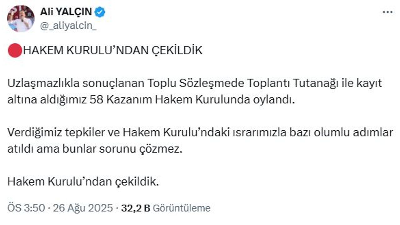 Memur Sendikaları Konfederasyonu (Memur-Sen) Genel Başkanı Ali Yalçın, sosyal medya hesabından yaptığı açıklamada, "Uzlaşmazlıkla sonuçlanan Toplu Sözleşme'de toplantı tutanağı ile kayıt altına aldığımız 58 kazanım, Hakem Kurulu'nda oylandı. Verdiğimiz tepkiler ve Hakem Kurulu'ndaki ısrarımızla bazı olumlu adımlar atıldı ama bunlar sorunu çözmez. Hakem Kurulu'ndan çekildik" dedi. (DHA)