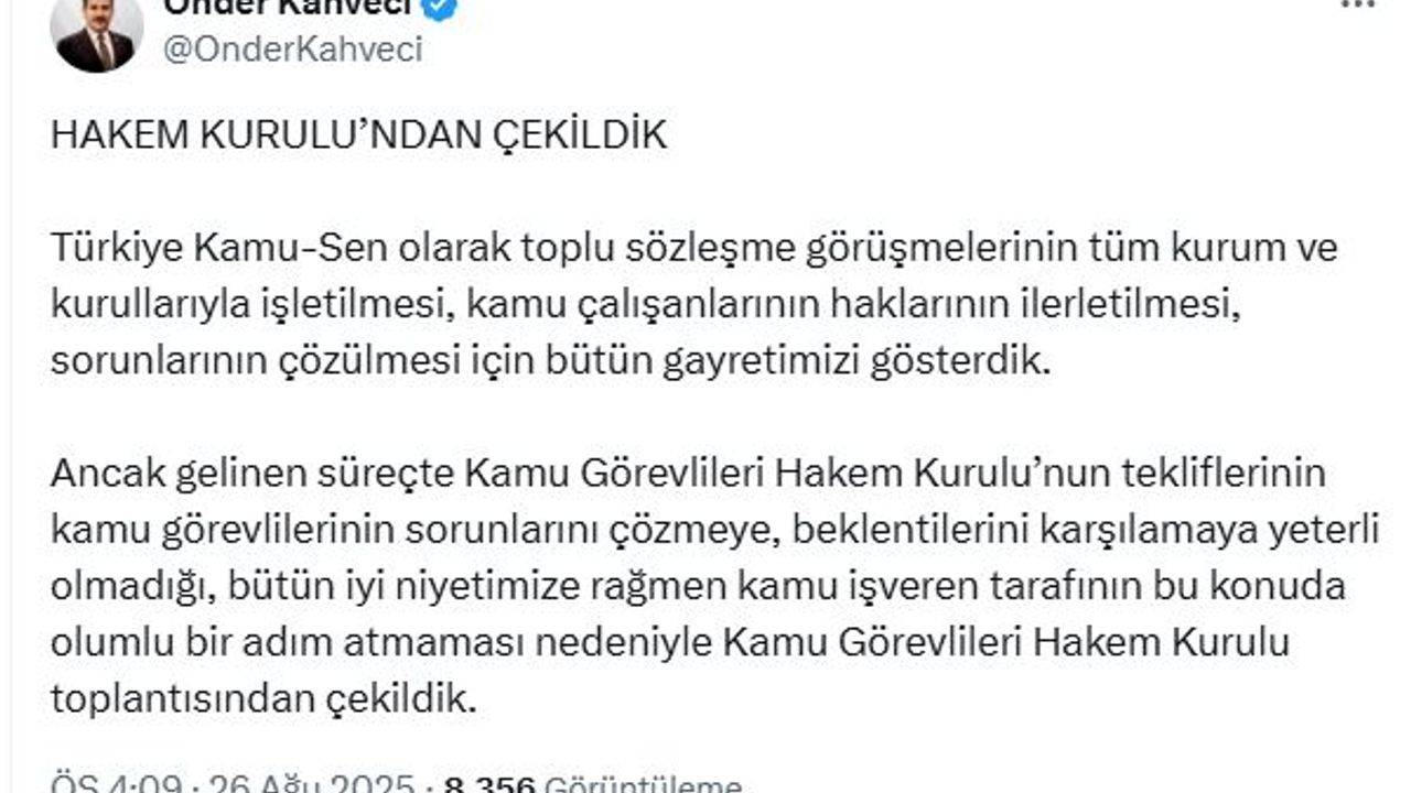 Türkiye Kamu Çalışanları Sendikaları Konfederasyonu (Türkiye Kamu-Sen) Genel Başkanı Önder Kahveci, sosyal medya hesabından yaptığı açıklamada, "Türkiye Kamu-Sen olarak Toplu Sözleşme görüşmelerinin tüm kurum ve kurullarıyla işletilmesi, kamu çalışanlarının haklarının ilerletilmesi, sorunlarının çözülmesi için bütün gayretimizi gösterdik. Ancak gelinen süreçte Kamu Görevlileri Hakem Kurulu'nun tekliflerinin kamu görevlilerinin sorunlarını çözmeye, beklentilerini karşılamaya yeterli olmadığı, bütün iyi niyetimize rağmen kamu işveren tarafının bu konuda olumlu bir adım atmaması nedeniyle Kamu Görevlileri Hakem Kurulu toplantısından çekildik" dedi. (DHA)