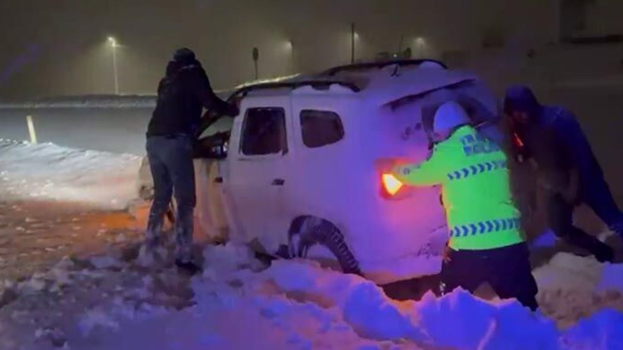 Iğdır ile Ağrı'nın Doğubayazıt ilçesi kara yolunda etkili olan kar yağışı nedeniyle yolda kalanlara polis ekipleri yardım etti. İl Emniyet Müdürlüğü'ne bağlı Bölge Trafik Denetleme Şube Müdürlüğü ekipleri, kar yağışına hazırlıksız yakalanıp yolda kalan sürücülerin araçlarını itti ya da zincir takmalarına yardımcı oldu. Polis ekipleri, yolda kalan sürücülere ve yanlarındakilerine yiyecek ikramında da bulundu.