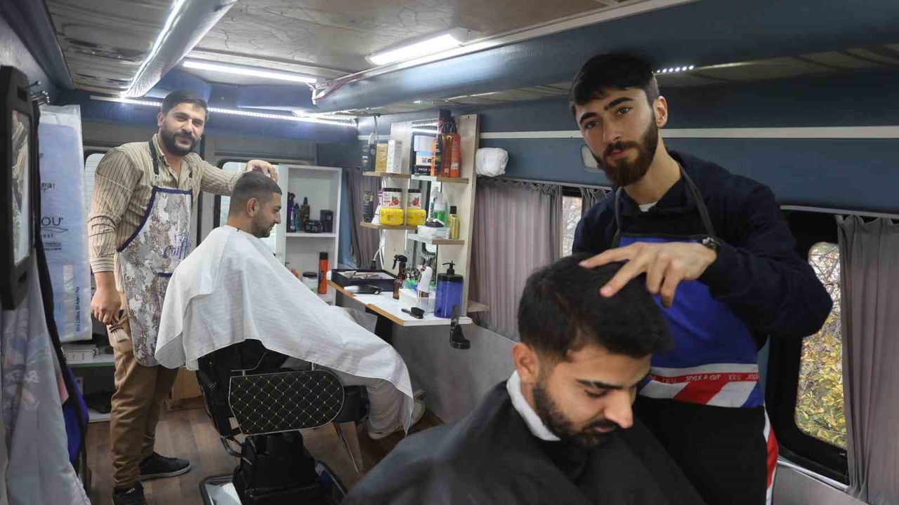 Hatay'ın Defne ilçesinde 15 yıldır berberlik yapan Salih Özçelik, arkadaşı İbrahim Culhacı'yla birlikte minibüsün içerisini düzenleyerek 'mobil berber aracı' yaptı. Mobil berber aracıyla ulaşımın zor olduğu yerlere giden iki arkadaş, müşterilerini berber dükkanından farksız mobil berber aracında tıraş ediyorlar.
