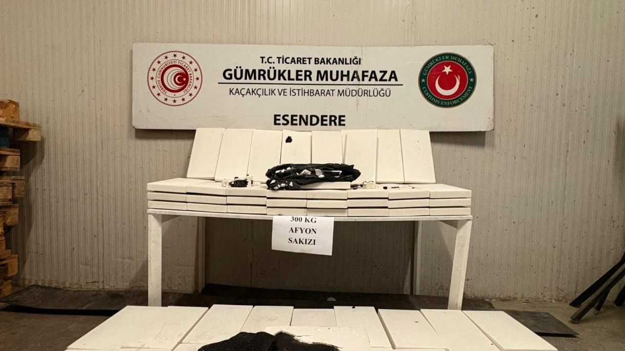 Gümrükler Muhafaza Genel Müdürlüğü Narkotik Suçlarla Mücadele Daire Başkanlığı koordinesinde, Hakkâri Gümrük Muhafaza Kaçakçılık ve Emniyet Müdürlüğü’ne bağlı İstihbarat Müdürlüğü’nce yürütülen çalışmalar kapsamında, İran'dan Türkiye'ye Esendere Gümrük Kapısından giriş yapan Türk plakalı TIR, durdurularak arama yapıldı. Narkotik köpeği ile TIR'da yapılan aramada, dorsede ahşap kasalar içerisindeki mermer blokları arasında gizlenen 300 kilo afyon sakızı ele geçirilirken, sürücü gözaltına alındı.