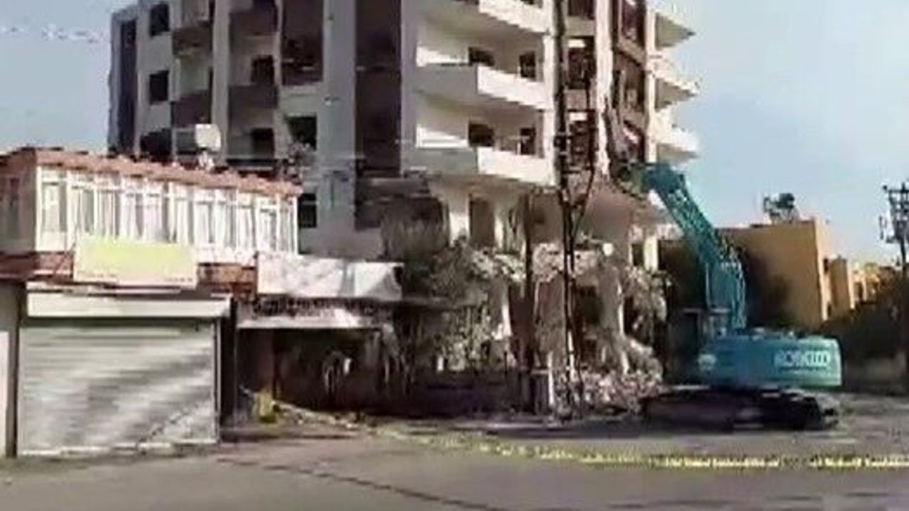 Hatay’ın Dörtyol ilçesinde 5 katlı binanın iş makinesiyle yıkıldığı anlar cep telefonu kamerasına yansıdı.