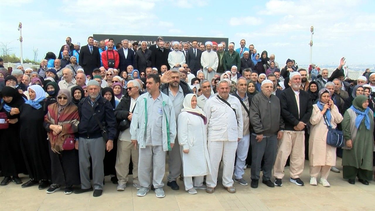 Programdan sonra Diyanet İşleri Başkanı Ali Erbaş, hacı adaylarıyla caminin avlusunda hatıra fotoğrafı çektirdi. (DHA)