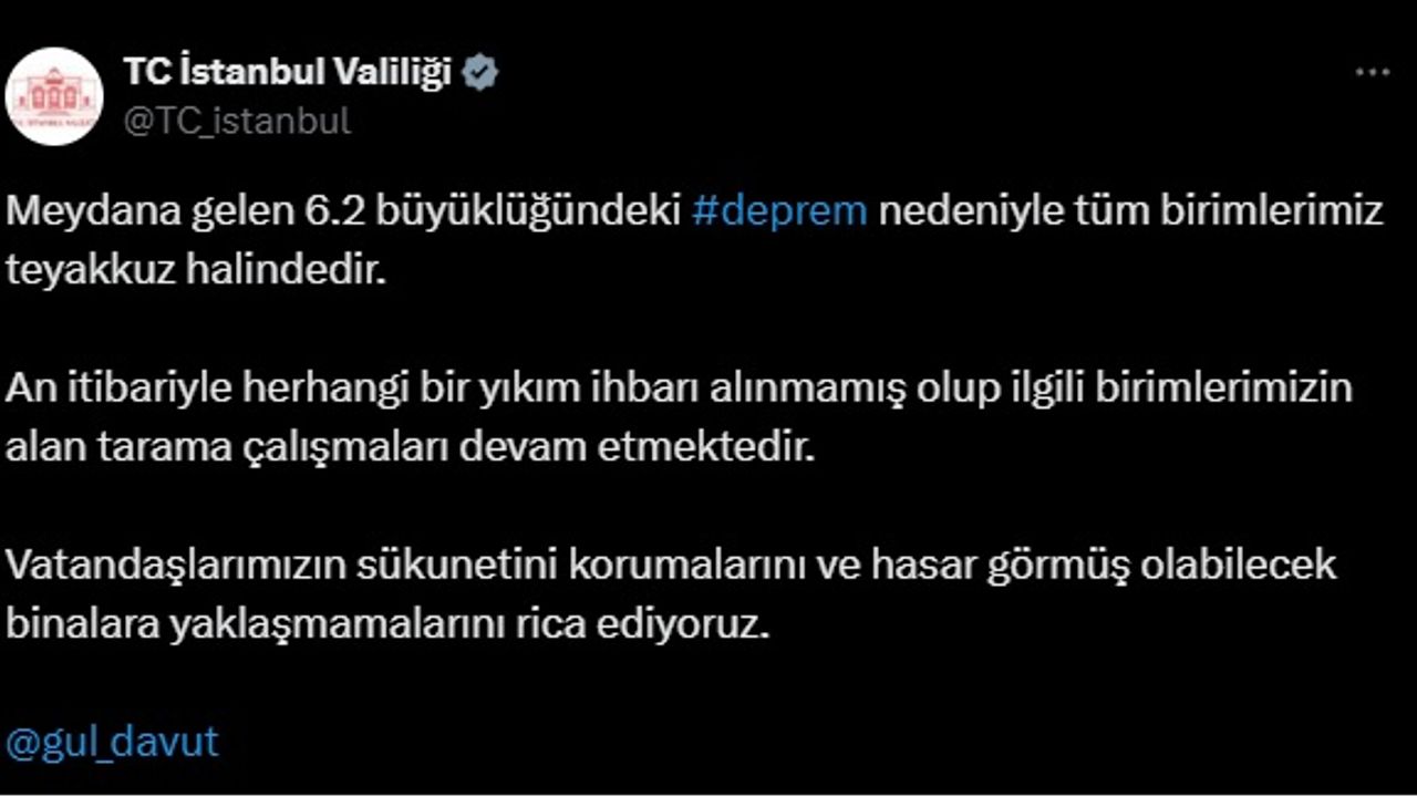 İSTANBUL, (DHA)- İSTANBUL Valiliği'nden 6,2 büyüklüğündeki deprem sonrası açıklama yapıldı.