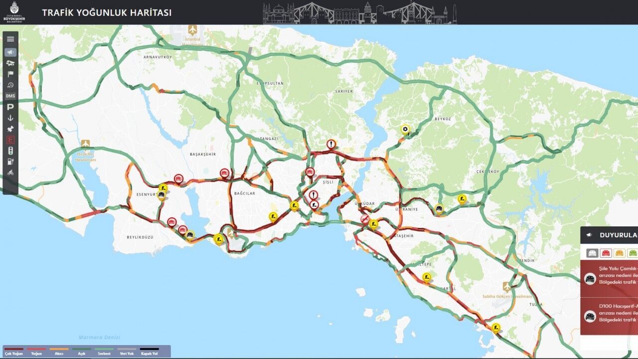 İstanbul'da Cuma akşamı artan iş çıkışı yoğunluğu nedeniyle ana arterlerde trafik yoğunluğu oluştu. İstanbul Büyükşehir Belediyesi Trafik Yoğunluğu Haritası verilerine göre saat 17.45 itibarıyla yoğunluk yüzde 81'e ulaştı. D-100 Karayolu Bahçelievler-Yenibosna mevkinde trafik durma noktasına geldi. Kara yollarında araçların güçlükle ilerlediği görüldü. (DHA)
