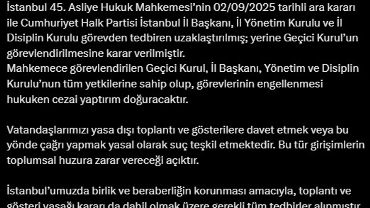 Konuyla ilgili sosyal medya hesabından açıklama yapan İstanbul Valisi Davut Gül paylaşımında, "İstanbul 45. Asliye Hukuk Mahkemesi’nin 02/09/2025 tarihli ara kararı ile Cumhuriyet Halk Partisi İstanbul İl Başkanı, İl Yönetim Kurulu ve İl Disiplin Kurulu görevden tedbiren uzaklaştırılmış; yerine Geçici Kurul’un görevlendirilmesine karar verilmiştir. Mahkemece görevlendirilen Geçici Kurul, İl Başkanı, Yönetim ve Disiplin Kurulu’nun tüm yetkilerine sahip olup, görevlerinin engellenmesi hukuken cezai yaptırım doğuracaktır. Vatandaşlarımızı yasa dışı toplantı ve gösterilere davet etmek veya bu yönde çağrı yapmak yasal olarak suç teşkil etmektedir. Bu tür girişimlerin toplumsal huzura zarar vereceği açıktır. İstanbul’umuzda birlik ve beraberliğin korunması amacıyla, toplantı ve gösteri yasağı kararı da dahil olmak üzere gerekli tüm tedbirler alınmıştır. Bu süreçte tüm hemşehrilerimizi sağduyulu davranmaya, hukuka ve demokratik olgunluğa uygun şekilde hareket etmeye davet ediyoruz" ifadelerini kullandı. (DHA)