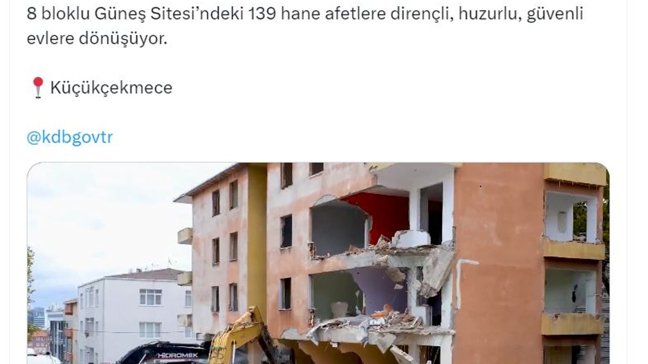 Çevre, Şehircilik ve İklim Değişikliği Bakanı Murat Kurum, 6 aylık süreçte projenin geldiği son aşamayı sosyal medya hesabından paylaştı. Bakan Kurum, "İlk adımı Güneş Sitesi sakinleri attı, biz de 'Yarısı Bizden' dedik ve harekete geçtik. 8 bloklu Güneş Sitesi'ndeki 150 hane afetlere dirençli, sağlam, güvenli evlere dönüşüyor. İlk adım sizden, yarısı bizden" dedi.