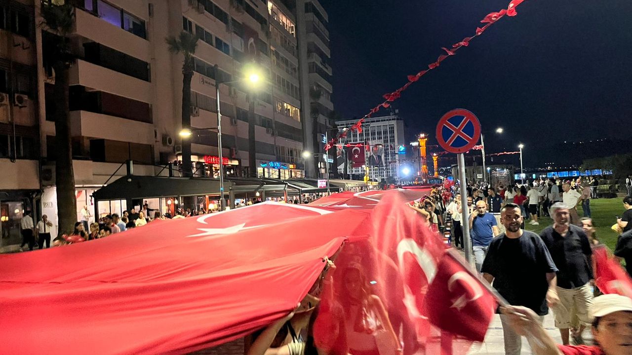 İzmir’in düşman işgalinden kurtuluşunun 103’ncü yıl dönümü etkinlikleri kapsamında binlerce kişi Cumhuriyet Meydanı’nda fener alayına katıldı. Gündoğdu Meydanı’na yürüyen fener alayındakiler, 350 metrelik Türk bayrağı taşıdı. Binlerce kişi ellerinde Türk bayrakları ile marşlar söyledi. Düzenlenen fener alayı, Kültürk Park Lozan Kapısı'nda sona erdi. (DHA)
