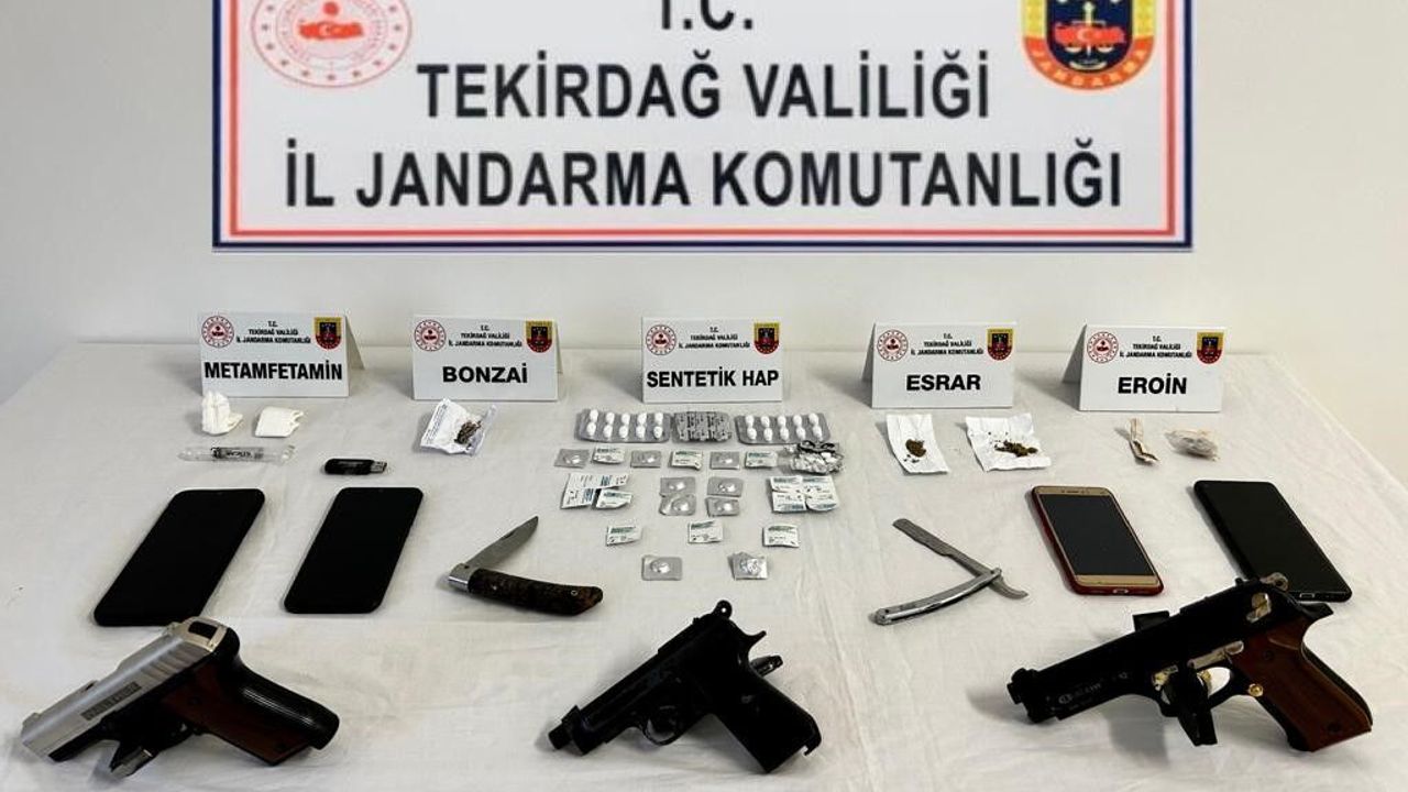 Tekirdağ İl Jandarma Komutanlığınca uyuşturucu ile mücadele kapsamında yapılan çalışmalarda, Kapaklı ilçesinde Uyuşturucu ve Uyarıcı Madde Ticareti yapan şahıslara yönelik olarak 9 adrese operasyon düzenlendi. Operasyonda, 1 gram eroin, 2 gram esrar, 1 gram metamfetamin, 2 gram bonzai, 52 adet renkli reçeteye tâbi sentetik hap, 1 adet uyuşturucu madde kullanma aparatı, 3 adet ruhsatsız tabanca, 22 adet tabanca fişeği, 2 adet bıçak, ele geçirildi.
