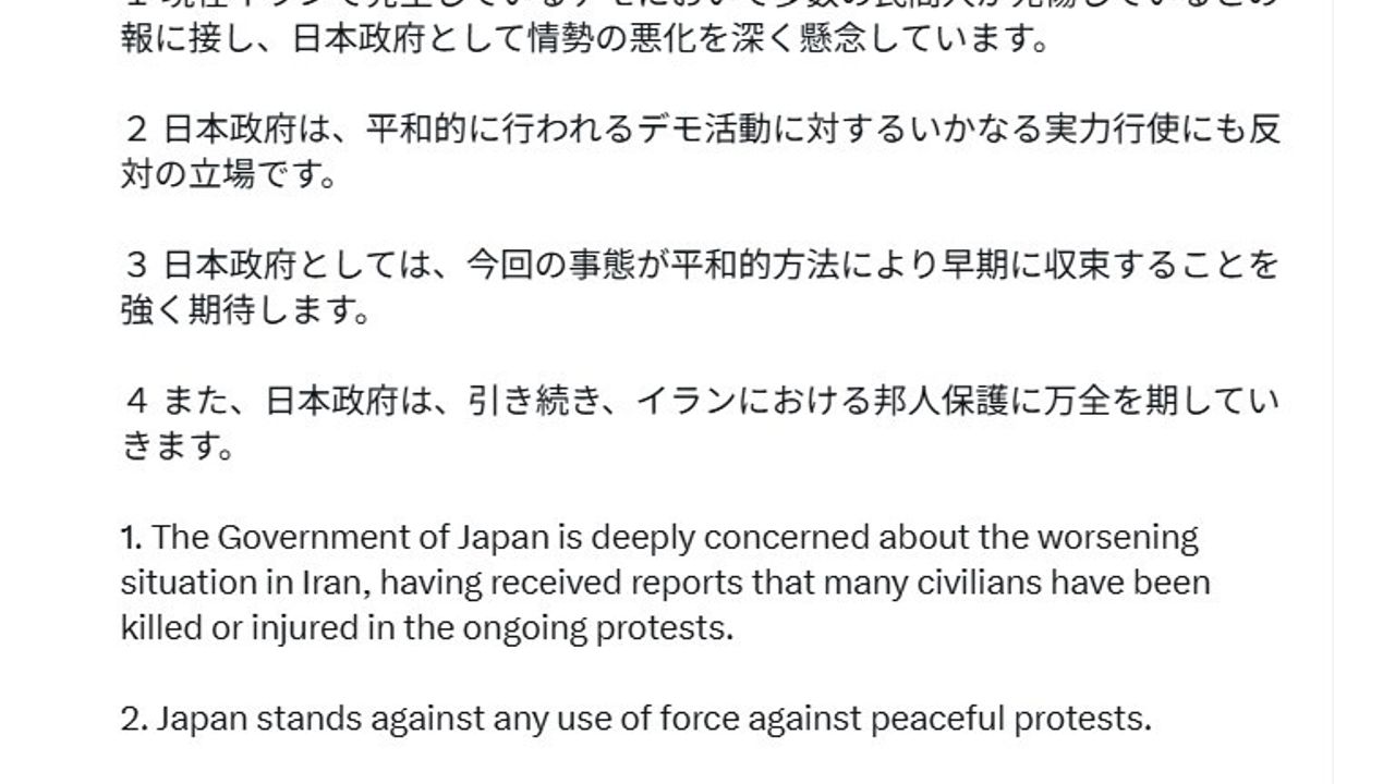 Japonya Başbakanı Sanae Takaichi, Japonya hükümetinin İran'daki kötüleşen durumdan 'derin endişe duyduğunu' belirterek, 'Japonya, barışçıl protestolara yönelik her türlü güç kullanımına karşıdır. Japonya, mevcut durumun barışçıl yollarla ivedilikle çözüme kavuşturulmasını güçlü bir şekilde temenni etmektedir' açıklamasında bulundu.