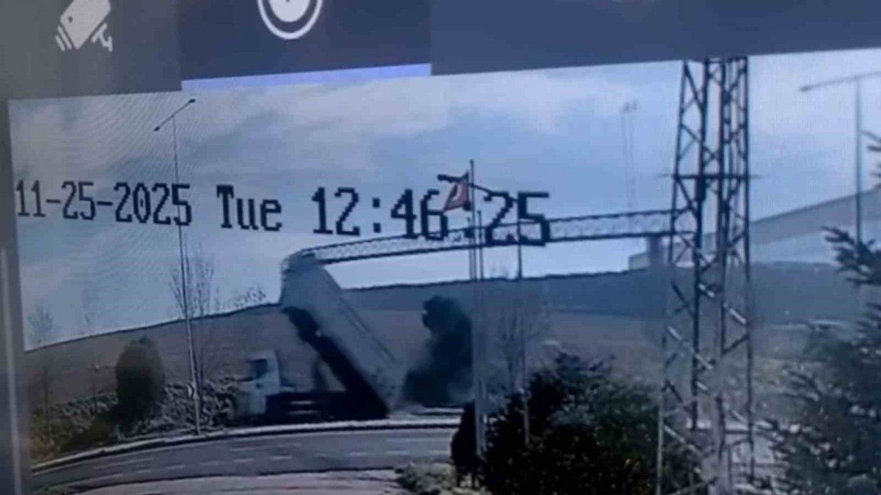 Tekirdağ’ın Muratlı ilçesinde Organize Sanayi Bölgesi’nde seyir halindeki kamyonun açılan damperi, kamera ve aydınlatma direklerini yıktı. O anlar güvenlik kamerasına yansıdı.