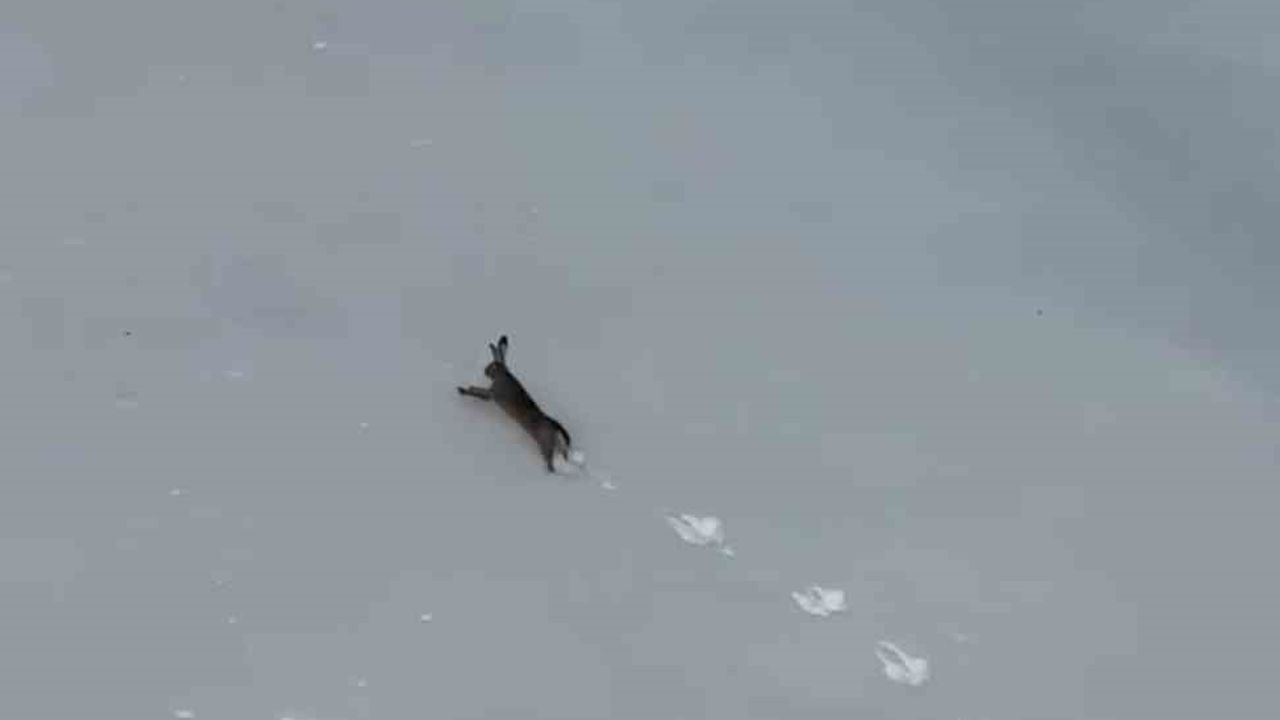 Karabük'te Keltepe Kayak Merkezi'nde kar üzerinde koşan bir yaban tavşanı, bir vatandaş tarafından cep telefonu kamerasıyla görüntülendi.