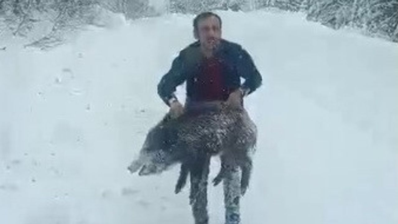 Sinop'un Erfelek ilçesinde karlı yolda karşılaştığı yaban domuzu sürüsünden bir yavruyu araçtan inerek kovalayıp eliyle yakalayan vatandaş, sosyal medyada büyük yankı uyandıran görüntülere ilişkin konuştu.