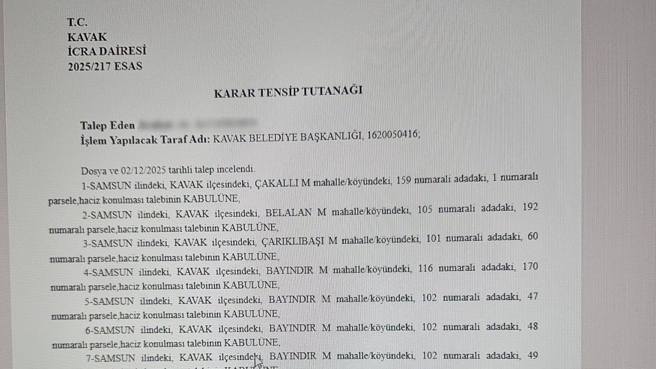 Mahkeme, 02 Aralık 2025 tarihli talep doğrultusunda Kavak’ın Çakallı, Belalan, Çarıkbaşı, Bayındır, Demirci, Mert ve Karadağ mahallelerinde bulunan ada ve parsel numaraları belirtilen gayrimenkullere haciz konulmasını kabul etti. Kararda, toplam 10 taşınmaz hakkında haciz talebinin yerinde bulunduğu ifade edildi.