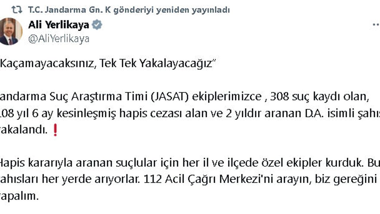 ANKARA, (DHA)- İÇİŞLERİ Bakanı Ali Yerlikaya, 308 suç kaydı olan ve 108,5 yıl kesinleşmiş hapis cezası bulunan firari suçlunun Kırklareli'de yakalandığını açıkladı.