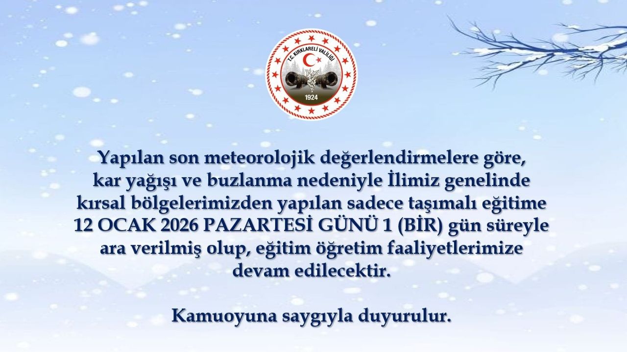 Kırklareli Valiliği tarafından yapılan son meteorolojik değerlendirmelere göre, il genelinde etkili olması beklenen kar yağışı ve buzlanma sebebiyle ulaşımda aksamalara yol açabileceği değerlendirilerek, kırsal bölgelerden yapılan taşımalı eğitime 12 Ocak 2026 Pazartesi günü 1 gün süreyle ara verildi.