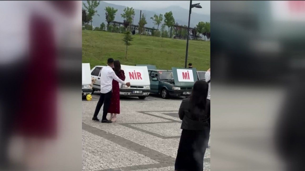 Osmangazi ilçesinde yaşayan otomobil tutkunu Mehmet G., bir süredir birlikte olduğu kız arkadaşı Gülsüm A.'ya özel bir evlilik teklifi planladı. Mehmet G., arkadaşlarına ait aynı marka ve model otomobilleri, Atıcılar Mahallesi’ndeki otoparkta bir araya getirdi. 8 otomobili yan yana sıralayan Mehmet G., büyük kağıtlara heceleyerek yazdırdığı ‘Benimle evlenir misin’ yazısını, otomobillerin açık olan ön kaputlarının üzerine yapıştırdı. Kırmızı halı ve çiçeklerle süslettiği yoldan, kız arkadaşını elinden tutarak otoparka getiren ve otomobillerden yükselen şarkı eşliğinde evlilik teklif eden Mehmet G., Gülsüm A.'dan ‘Evet’ yanıtını aldı. Çift, otomobillerin önünde dans ederken, arkadaşları da alkışlar ve ıslıklarla tebrik etti. (DHA)
