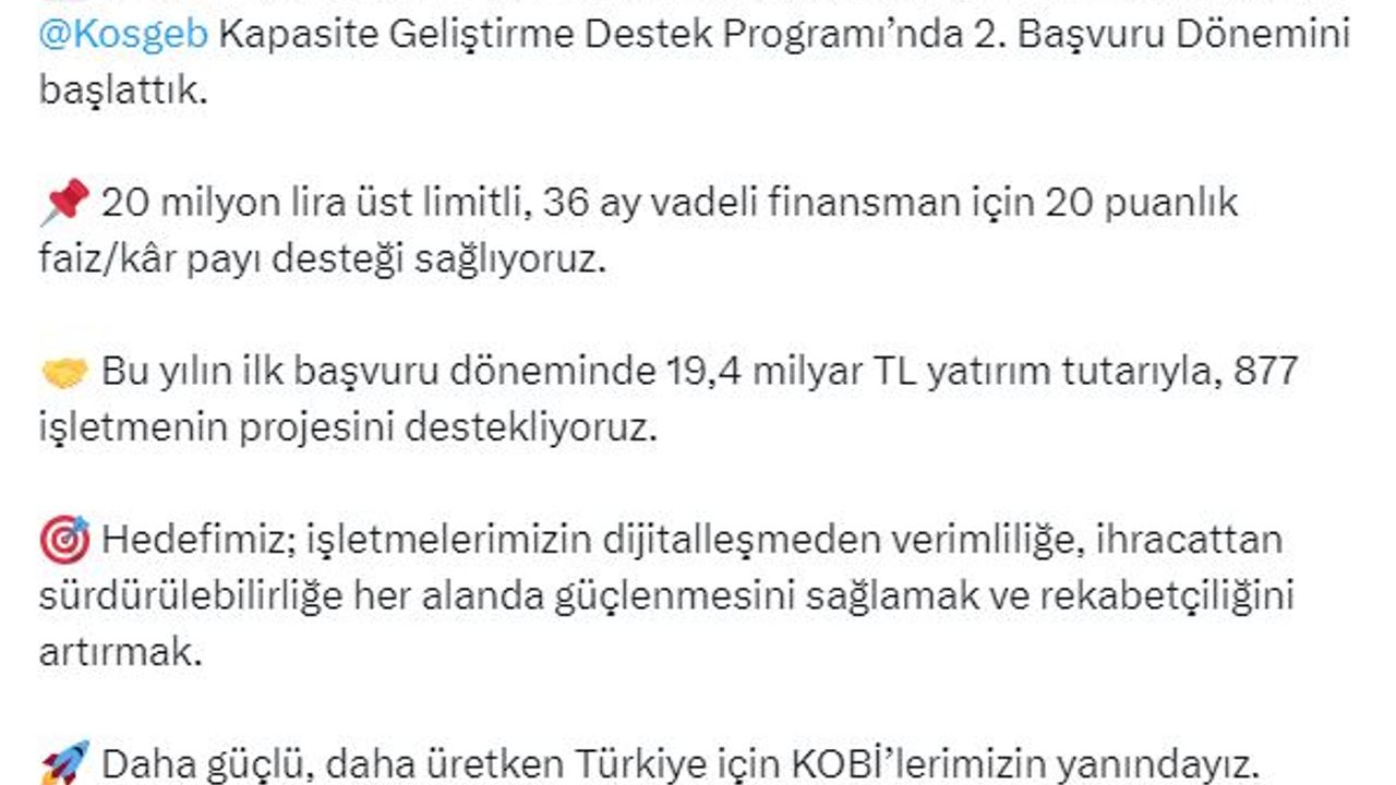 Bakan Kacır, sosyal medya hesabı üzerinden yaptığı açıklamada, küçük ve orta büyüklükteki işletmeleri büyütmek için hayata geçirilen, KOSGEB Kapasite Geliştirme Destek Programı'nda 2'inci başvuru döneminin başladığını belirtti. Kacır, "20 milyon lira üst limitli, 36 ay vadeli finansman için 20 puanlık faiz/kar payı desteği sağlıyoruz. Bu yılın ilk başvuru döneminde 19,4 milyar TL yatırım tutarıyla, 877 işletmenin projesini destekliyoruz. Hedefimiz; işletmelerimizin dijitalleşmeden verimliliğe, ihracattan sürdürülebilirliğe her alanda güçlenmesini sağlamak ve rekabetçiliğini artırmak. Daha güçlü, daha üretken Türkiye için KOBİ'lerimizin yanındayız" dedi. 2 Mayıs itibarıyla başlayan başvurular, 30 Haziran 2025 tarihine kadar yapılabilecek. Detaylara, http://kosgeb.gov.tr internet adresinden ulaşılabilecek. (DHA)