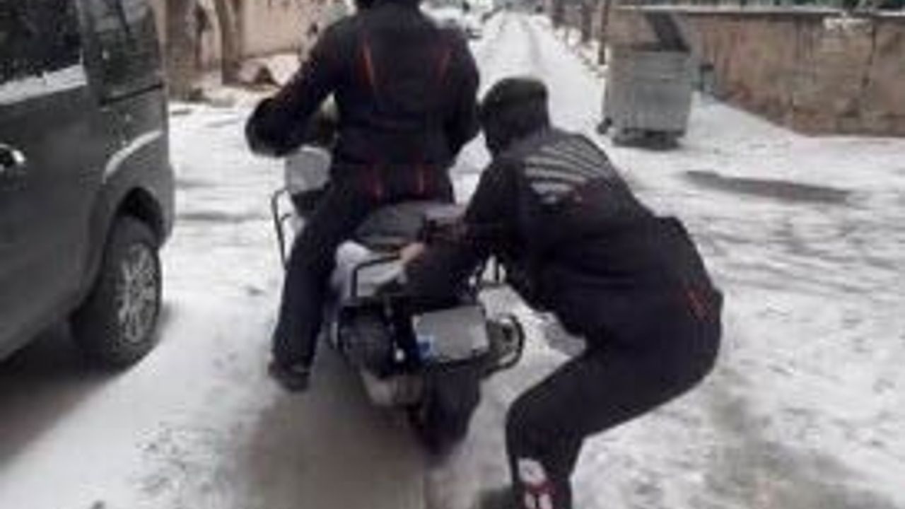 Hava sıcaklıklarının eksi derecelere düşmesiyle birlikte geçtiğimiz gün Eskişehir'de zeminler buz tuttu. Yolların kayganlaşması sebebiyle sürücüler trafikte zor anlar yaşarken, 2 kurye bu durumu fırsata çevirdi. Kuryelerden birisi yavaş şekilde motosikleti kullanırken, diğeri ise araca arkadan tutunup buzlu zeminde kaydı. Cep telefonu kamerası ile kaydedilen görüntülerde, zemin şartları sebebiyle motosikletin de zaman zaman ilerlemekte güçlük çektiği görüldü. Kuryelerin birlikte eğlendiği o keyifli anlara görenleri tebessüm ettirdi.