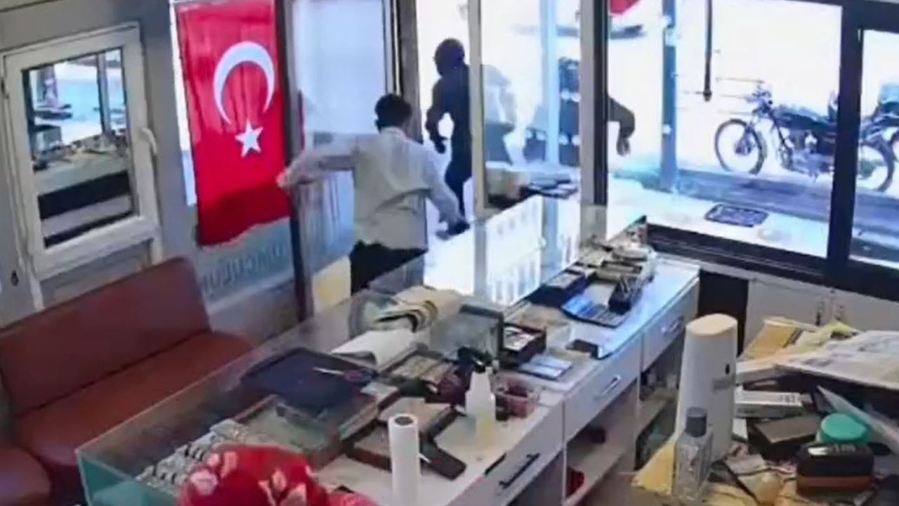 Soygun girişimi, iş yerinin güvenlik kamerasına yansıdı. (DHA)