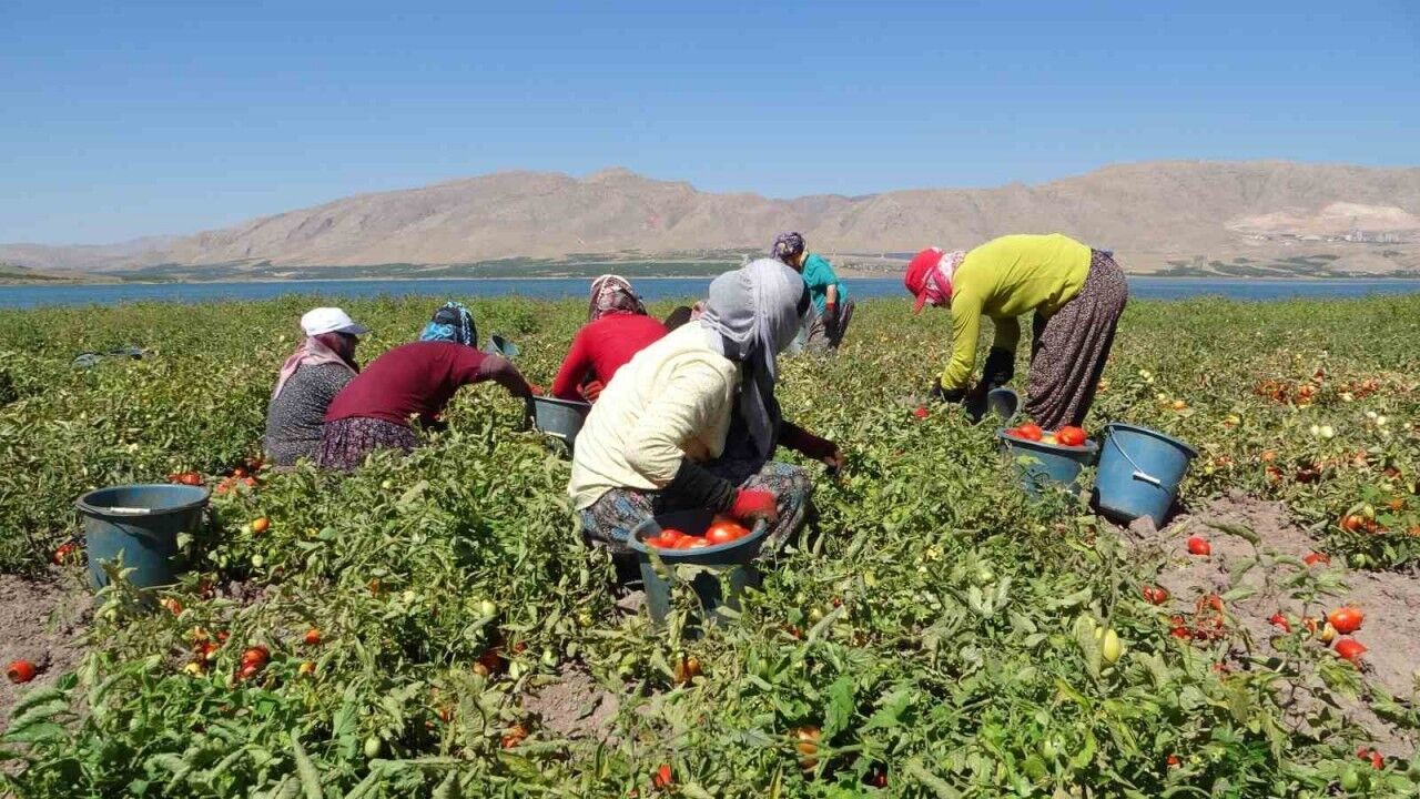 Malatya’da, Karakaya Baraj Gölü’nde suların çekildiği alanda tarımsal üretim yapılıyor. Onlarca dekarlık alanda ekimi yapılan domateslerde ise hasat sürüyor.