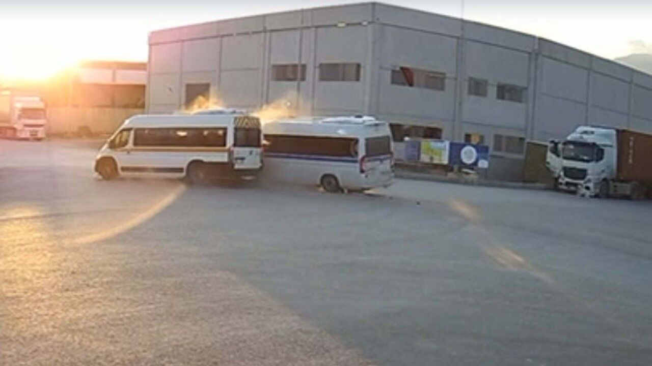 Kaza, bir fabrikanın güvenlik kamerasına yansıdı. Görüntülerde, minibüslerin çarpışması ve araçların savrulduğu anlar yer alıyor.