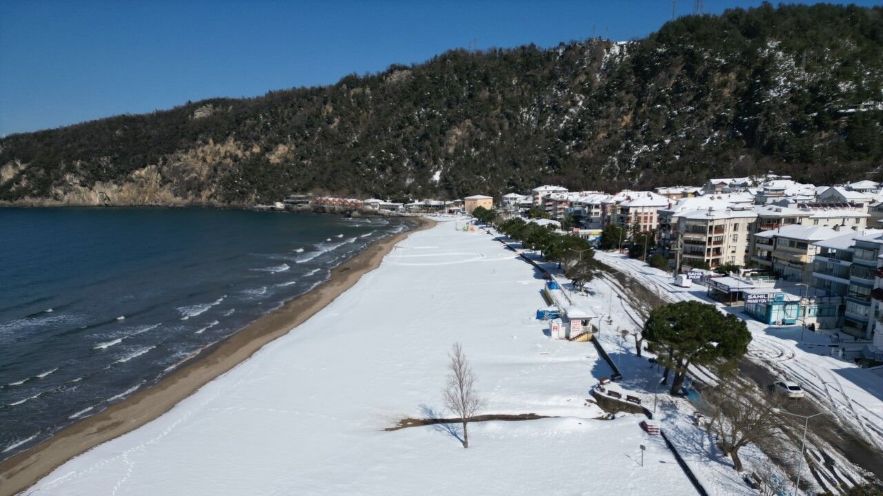 Ayhan ACAR/BARTIN, (DHA)- BARTIN'ın 3 kilometre uzunluğuyla tek mavi bayraklı plajı olan İnkumu sahili, kar yağışının ardından 30 santim karla kaplandı. Yaz aylarında yerli ve yabancı turistlerin ilgi gösterdiği plajın karlı manzarası dronla görüntülendi.