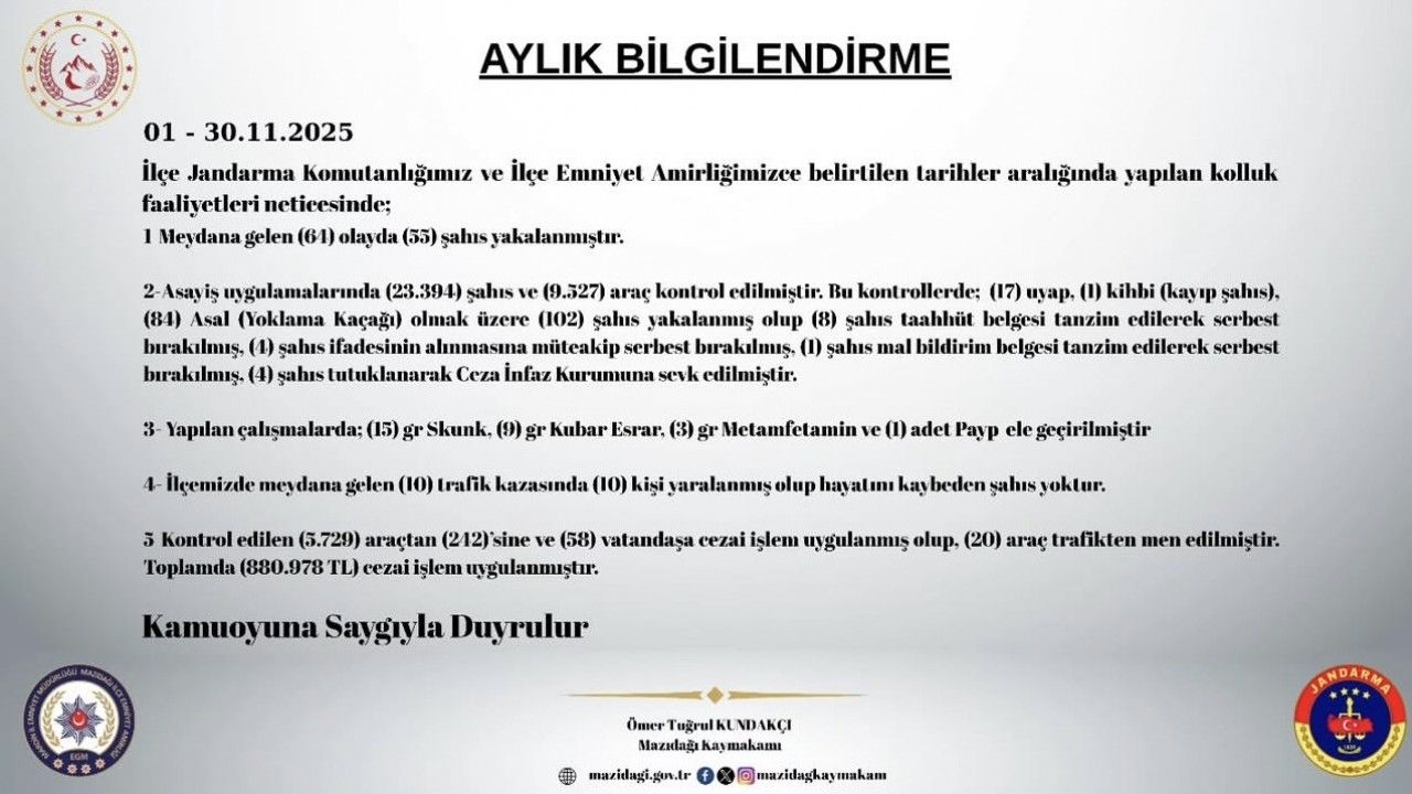 Mazıdağı Kaymakamlığı tarafından yapılan açıklamada, ilçede huzur ve güvenliğin artırılmasına yönelik yoğun çalışmaların yürütüldüğü belirtildi. Kasım ayı boyunca gerçekleştirilen asayiş uygulamalarında toplam 23 bin 394 şahıs sorgulanırken, 9 bin 527 araç kontrol edildi. Çalışmalar sırasında yakalama kararı bulunan 102 şahıs yakalandı. Yakalanan bu kişilerden 1’i tutuklanarak Ceza İnfaz Kurumu’na sevk edildi. Ayrıca, meydana gelen 61 olayda 53 şahıs yakalandı. Kontrollerde uyuşturucu/uyarıcı madde suçlarından 17 kişi ve kayıp olarak aranan 1 kişi olmak üzere toplam 18 kişi hakkında yasal işlem yapıldı.