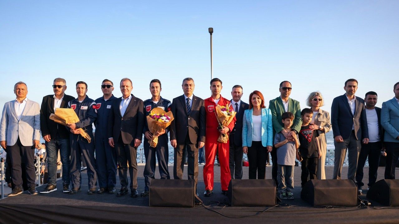 Mersin Valisi Atilla Toros ile Mersin Büyükşehir Belediye Başkanı Vahap Seçer, milletvekilleri ilçe belediye başkanlarının izlediği gösteride Türk Yıldızları, gökyüzünde görsel bir şölen oluşturdu. Türk Yıldızları gösteri sırasında, gökyüzünde renkli duman izleri gerçekleştirdiği hareketleri izleyen vatandaşlar cep telefonları, video kameraları ve fotoğraf makineleri ile anı kayıt altına aldı. (DHA)
