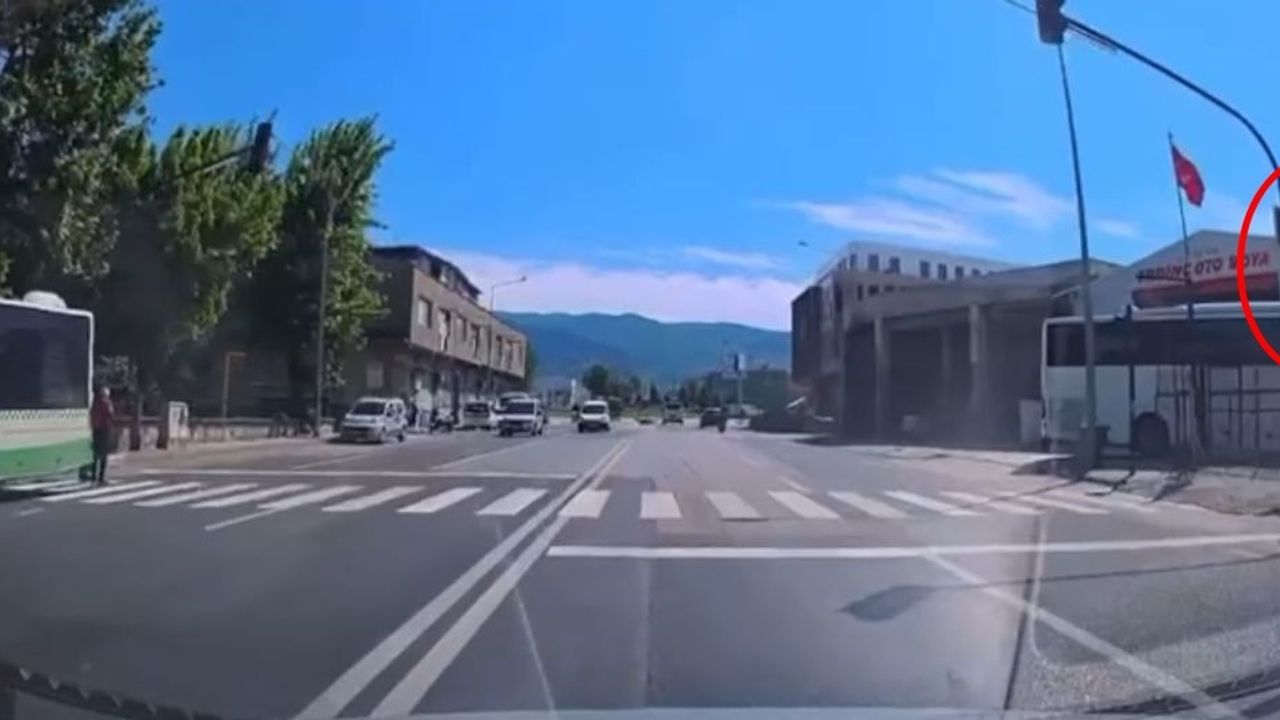 Osmangazi ilçesi Veysel Karani Mahallesi'nde yolcu minibüsünün sürücüsü, kırmızı ışıkta durmayıp ters şeride girerek, bekleyen araçları geçti. Bu sırada yaya geçidinden geçen 2 kişi ise üzerlerine gelen minibüsü görünce, koşarak ilerledi. Minibüs hızla yoluna devam ederken, o anlar diğer şeritte kırmızı ışıkta bekleyen otomobilin araç kamerasına yansıdı. (DHA)
