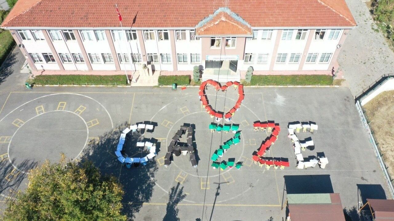 Pınarlıbacı İlk ve Ortaokulu öğrencilerinin, İsrail ordusunun Gazze Şeridi’ne yönelik yapılan saldırılara tepki göstermek ve Filistinlilere destek vermek gayesiyle hazırladıkları koreografi duygulandırdı. Okulun bahçesinde toplanan öğrenciler, Filistin bayrağındaki renklerle Gazze yazıp, ’Uçak geçince korkmasın çocuklar’, ’Savaşın iyisi, barışın kötüsü yoktur’, ’Savaşa hayır, ölüme hayır, kardeşlik olsun yarına dair’, ’Yurtta barış, dünyada barış’, ‘Savaşta zafer kimin olursa olsun sıkılan her kurşun annenin yüreğini vurur’ gibi mesajlara yer verdi. Öğretmen ve öğrencilerin yaptıkları koreografi ve görüntüler izleyenlerin takdirini topladı.
