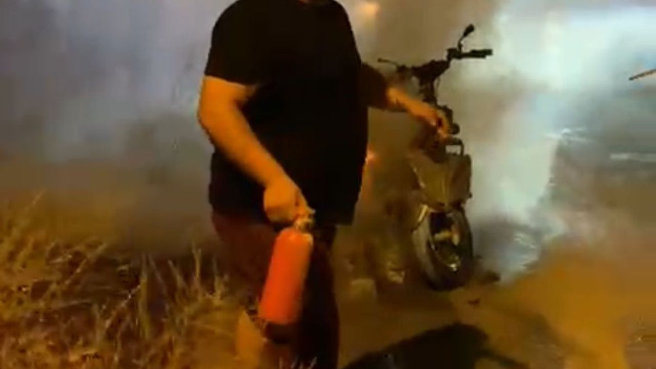 Osmangazi ilçesinde saat 20.00 sıralarında, Demirtaş mevkiisine seyir halinde olan motosiklet bir anda yanmaya başladı. Yangın rüzgarın da etkisiyle büyürken, motosikletin yandığını gören Halil A., bacağı alçıda olmasına rağmen yolcu koltuğunda olduğu araçtan inip, yangın söndürme tüpüyle alevleri söndürmeye çalıştı. O anlar bir kişi tarafından cep telefonu kamerasıyla kaydedildi. (DHA)