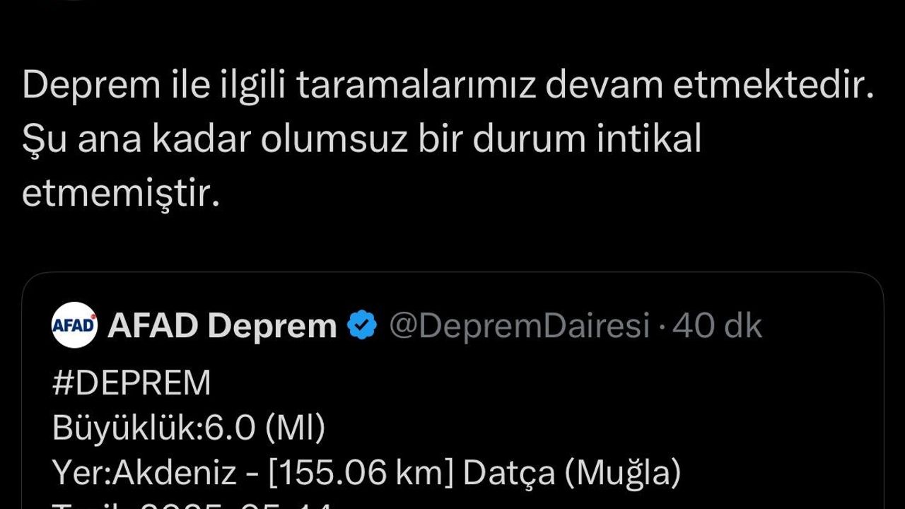Muğla Muğla açıklarında 6 büyüklüğünde deprem / Ek fotoğraflar 14.05.2025 - 03:02 14.05.2025 - 03:02 Abone Ol Gelişmelerden haberdar olmak istiyor musunuz? Google News’te Güncel53 sitemize abone olun. Abone Ol Bunlar da ilginizi çekebilir Menteşe’de tırın çarptığı motosiklet sürücüsü hayatını kaybetti Bağımlılık Farkındalığı Tiyatro Oyunu Fethiye’de Öğrencilerle Buluştu Kamyonette sıkışan iki kişi kurtarıldı Hastanede deprem ve yangın tatbikatı Okul kantinlerinde denetim Fethiye’de tarihi eser kaçakçılığı operasyonu: 8 gözaltı Prof. Dr. Karalezli: "Gençlerde diz ağrısı önemlidir"" ‘Bir Başka Yolculuk Gerek Bize’ grafik tasarım sergisi kapılarını açtı Köyceğiz’de ödüllü Voleybol Turnuvası başladı Muğlalı gençler Bulgaristan’ta Avrupa birliği projesine katıldı